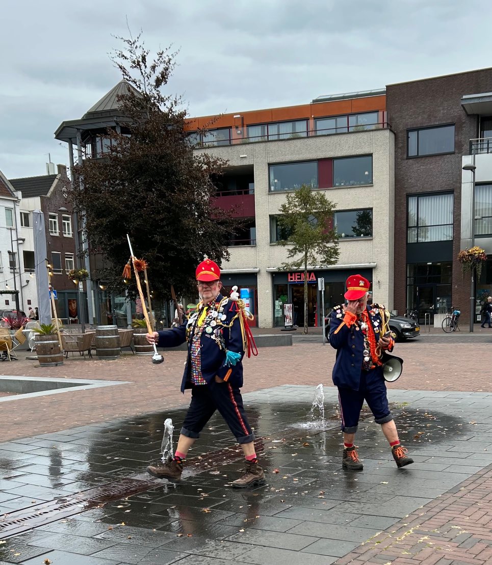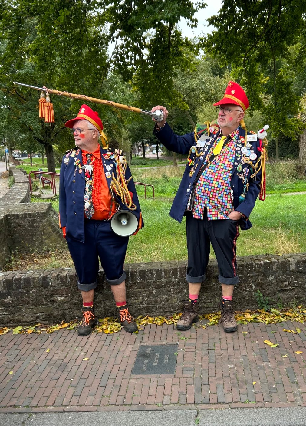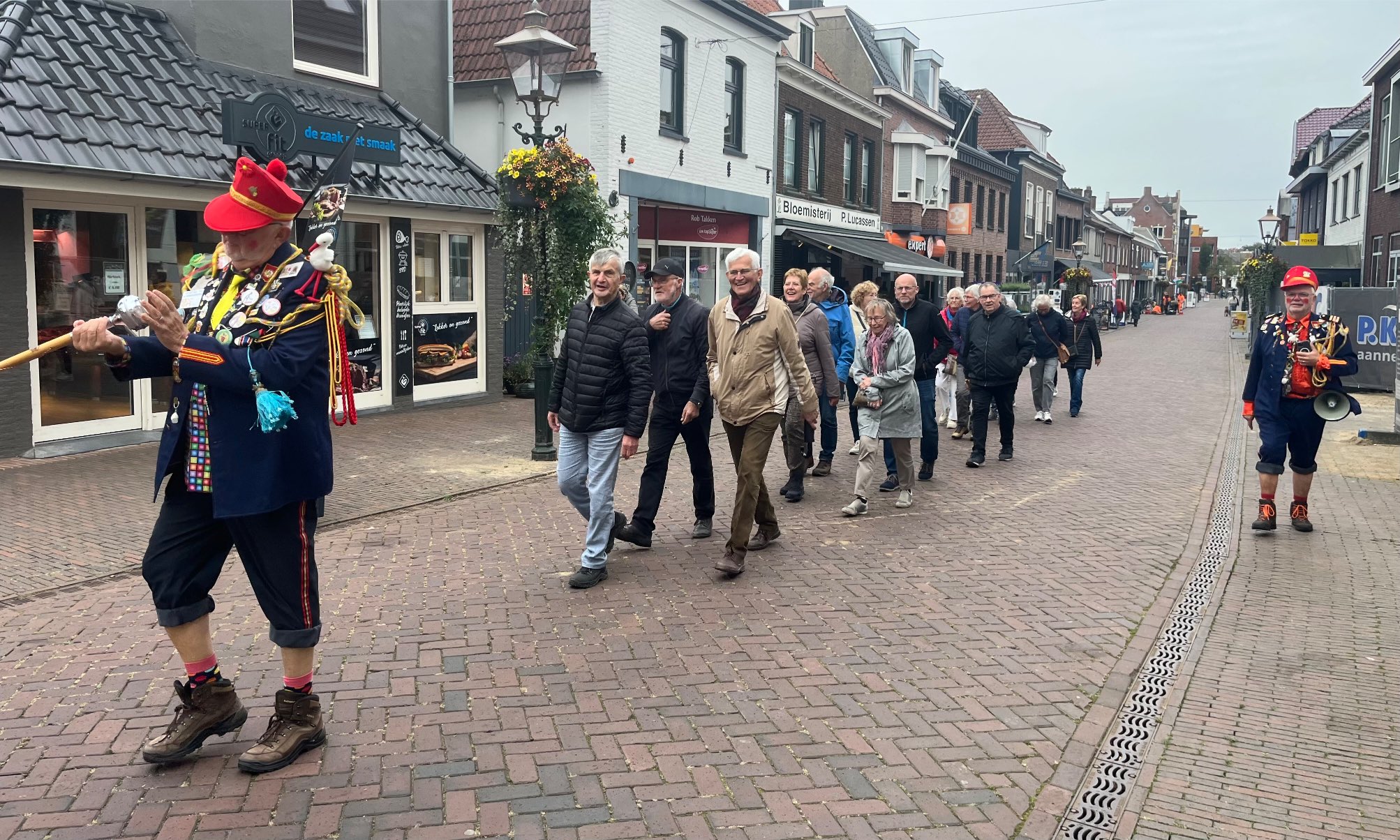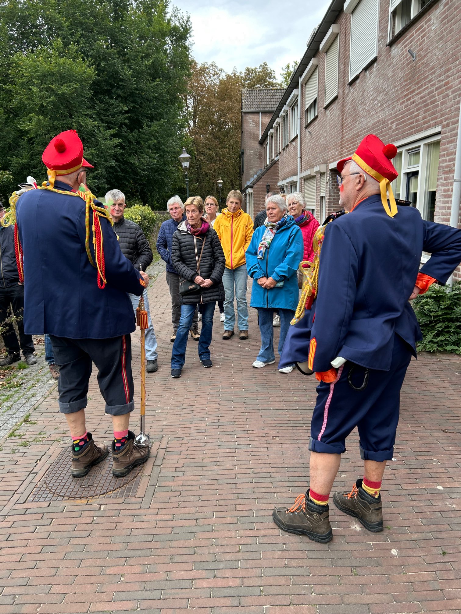 En jawel, precies om 14.00 uur kwamen ze aan: prachtig uitgedost en met veel muziek. Ze stelden zich voor als “de Kiep” en “den Gedooojde” – en vanaf dat moment wisten we dat dit géén gewone wandeling zou worden.