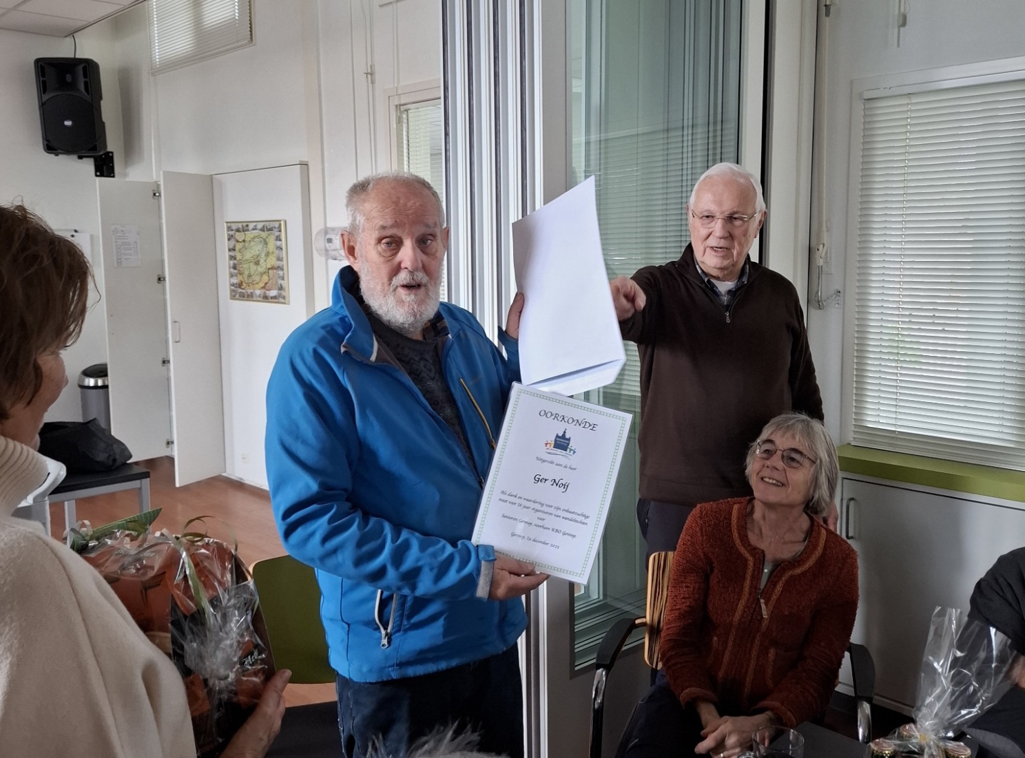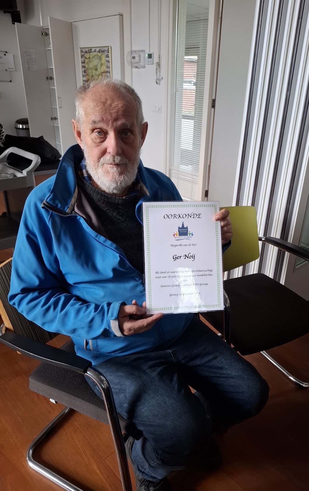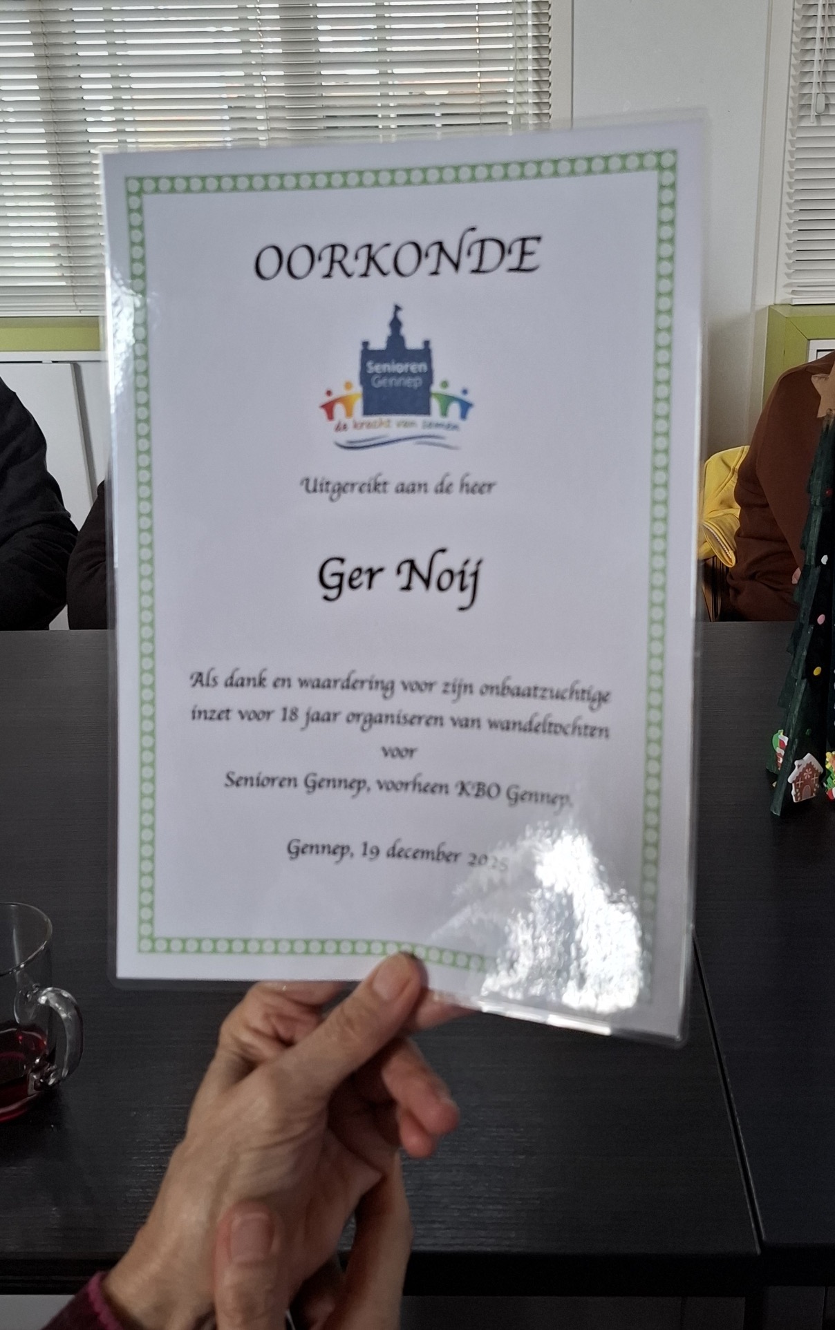 Vrijdag 19 december nam Ger Noij afscheid van zijn wandelclub. Achttien jaar lang heeft Ger elke laatste vrijdag van de maand een wandeltocht uitgezet in de omgeving van Gennep en tot voor kort liep hij ook altijd zelf mee. Totdat zijn knieën niet meer mee wilden werken.